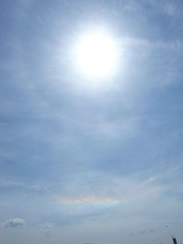 4月15日 福岡市 日暈と「環水平アーク」と呼ばれる気象現象 日暈(太陽の周りを広く囲む円の光)や幻日(太陽の左右に離れて出る明るい点の光)はときどき見ますが(このブログにもときどき載せていますが) 環水平アークははじめて見ました やや低いところ…