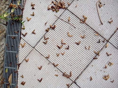 8月29日 警固公園(福岡市中央区)を歩いていて、足元に、「つばさ」(翼)がついた実のようなものを見つけました。 見上げると。 公園改装前からここにある木です。 資料などを総合すると、シナサワグルミの木のようです。 この公園には改装前、おなじく実…
